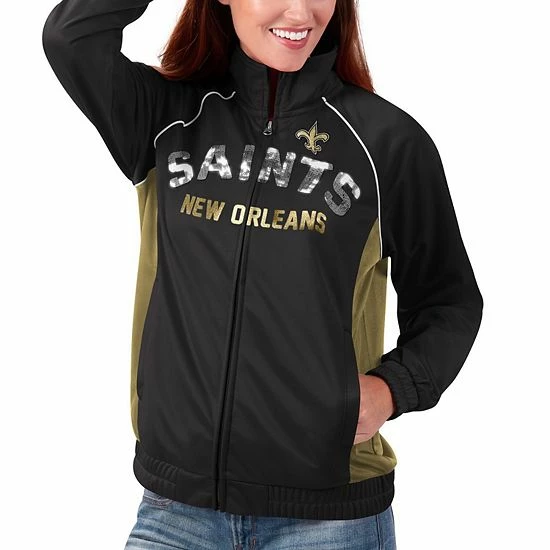 Sport the colors of your New Orleans Saints boldly with this Backfield full-zip track jacket from G-III 4Her by Carl Banks. Its two-tone design features the New Orleans Saints logo printed above the sparkly team name. Plus, raglan sleeves provide a little extra room for layering and more flexible movement.