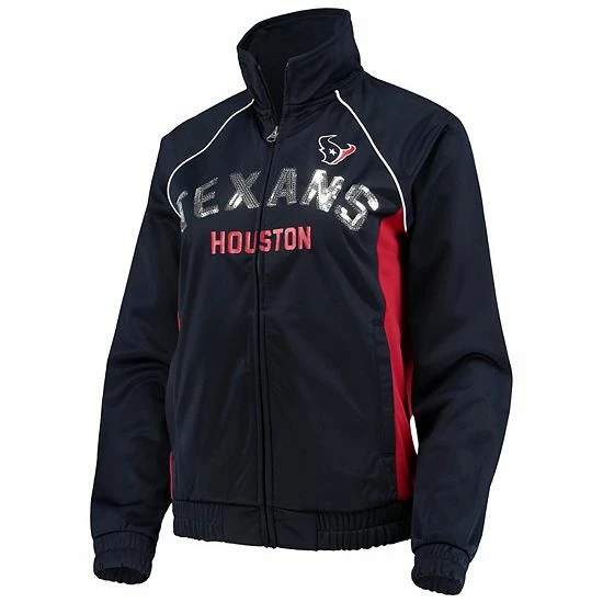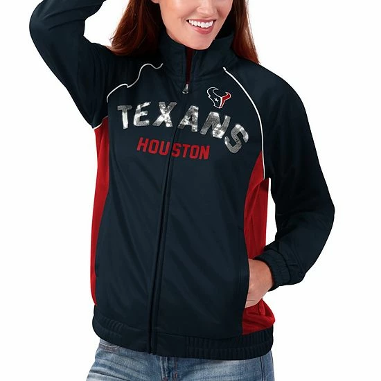 Sport the colors of your Houston Texans boldly with this Backfield full-zip track jacket from G-III 4Her by Carl Banks. Its two-tone design features the Houston Texans logo printed above the sparkly team name. Plus, raglan sleeves provide a little extra room for layering and more flexible movement.