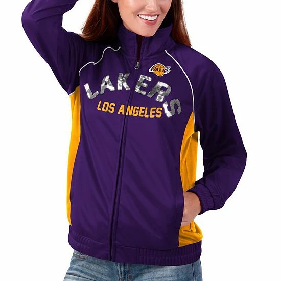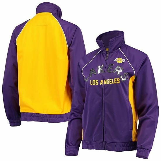 Show off the colors of your Los Angeles Lakers boldly with this Backfield full-zip track jacket from G-III 4Her by Carl Banks. Its two-tone design features the Los Angeles Lakers logo printed above the sparkly team name. Plus, raglan sleeves provide some extra room for layering and more comfortable movement.